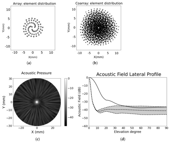 The Fermat spiral array was designed with a diameter of , 64–elements and a divergence angle , central frequency MHz, %, operating in water ( m/s) and focused at 60 mm. The aperture and its beampattern are shown in Figure 5: (a) array footprint, (b) coarray structure, (c) acoustic pressure, and (d) lateral profile of the acoustic pressure at each elevation angle (light grey area contoured by the dashed line).