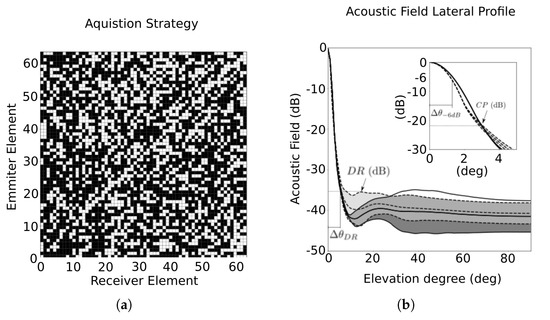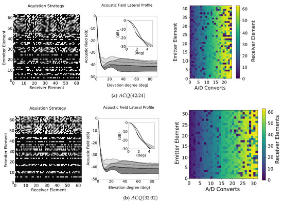 Then, using the proposed heuristic, the first acquisition strategy, : is illustrated in Figure 6. In this example, the Element Participation Restriction is defined by using 64 emitters and 64 parallel channels (::64) and the signals that are considered redundant are eliminated. Comparing to the , we achieved the same with only of the signals and a reduction in . Also, it has reduced the number of reception channels. The mean number of reception channels per emission is 25, with a maximum of 32 and a minimum of 14. Furthermore, it employs 450 fewer signals than the . Comparing the acoustic field of : with the original aperture, we see that the sidelobe distribution has a smoother distribution with an overall increase of only 2 dB in comparison to the .