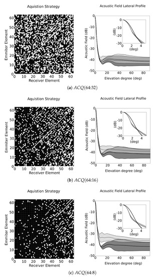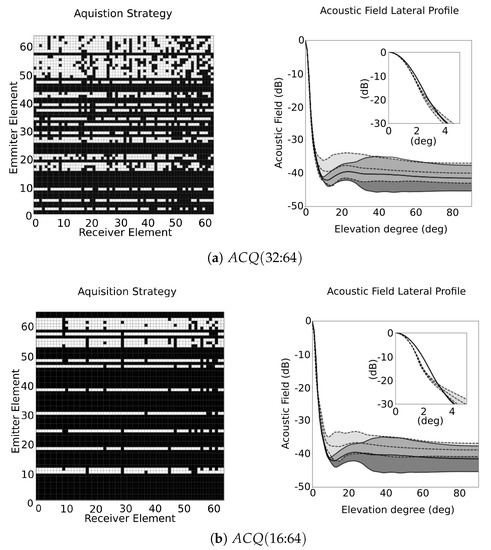Figure 11 illustrates the two proposed acquisition strategies and shows the lateral profile of the acoustic field, where dark grey corresponds to the acoustic field of the . Although the acoustic pressure is similar for the two configurations, it is possible to see that the reduction in the number of shots has a worse impact than the reduction of parallel channels in reception.