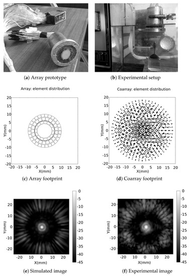 Figure 9c illustrates the segmented annular array element distribution and Figure 9d is the corresponding coarray. In order to obtain a more accurate response in our simulation model, the differences in the energy radiated per element and the element radiation pattern were taken into account. The comparison between experimental data and simulations are based on images from a spherical reflector. Figure 9e shows a simulated image of a point reflector and Figure 9f illustrates the experimental image, both set at mm, : mm and : mm and using the and . With this configuration, in water, experimental results shows a lateral resolution of and a dynamic range, limited by grating lobes at , of 20 dB. The differences between simulated and experimental images are due to anomalies in the radiation pattern of the real aperture and the diffraction response of the reflecting sphere. Furthermore, this probe shows significant variations in element-to-element sensitivities, reaching up to 4 dB, which increases the sidelobes level intensities.
