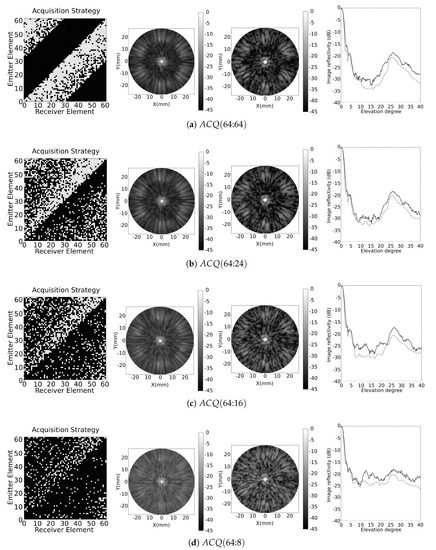 The results are summarised in Table 3, where and are also listed. In both cases, there was a reduction in from to and , respectively. The sidelobe distribution is comparable to the , so, in practice, the image quality is maintained in a similar range. However, the number of signals is reduced to less than a half when compared to (2080 to 1008), which means a significant cost reduction in processing. Lateral resolution is also better for the proposed strategies, as can be observed from .