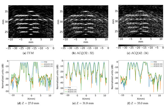 If the performance is tested against a simulated phantom containing several reflectors ( Figure 12), small differences between the strategies are highlighted. Although both proposed acquisition strategies increase the lateral resolution respect to the , they also show higher sidelobes. To analyse how the lateral resolution has been increased, we have presented lateral profiles at different depths in Figure 12d–f. If both strategies are compared, the : shows lower sidelobes than the :. To obtain a numerical value for this observation, we have used the mean of the ratio (pixel-by-pixel) between the normalized image obtained by the normalised image and the normalized image that is considered as the reference: