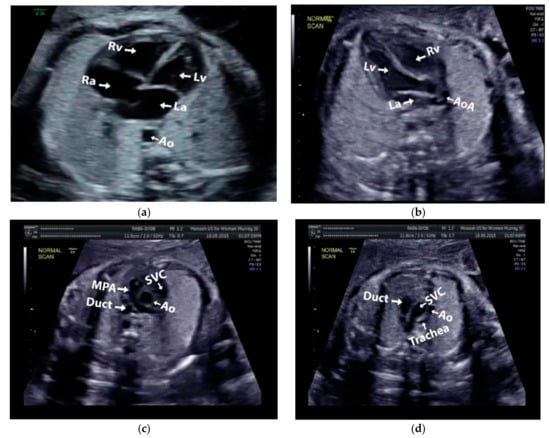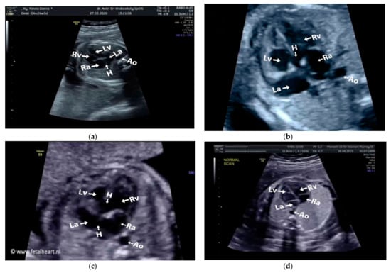 - Patel, N.; Narasimhan, E.; Kennedy, A. Fetal Cardiac US: Techniques and Normal Anatomy Correlated with Adult CT and MR Imaging. RadioGraphics 2017, 37, 1290–1303. [Google Scholar] [CrossRef] [PubMed]