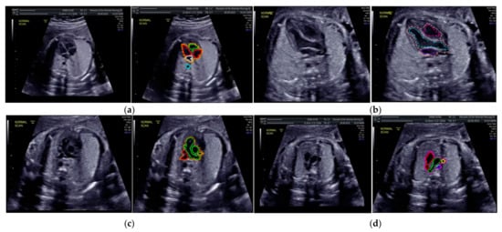 Fetal heart view with heart chamber segmentation in (a) 4CH, (b) 3VT, (c) LVOT, and (d) RVOT for normal heart anatomy structure. Fetal heart view boundary and heart chamber part as the same description with Figure 10.