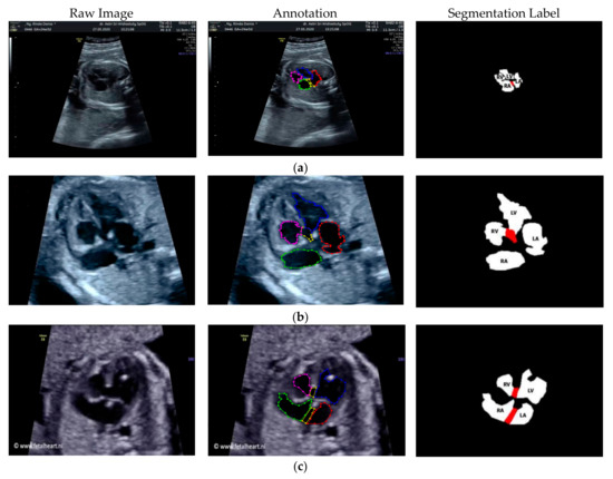 The sample of annotated image by maternal–fetal clinician for heart defect detection in case: (a) ASD; (b) VSD; and (c) AVSD. In the annotation, the green line is RA, the red line is LA, the purple line is RV, the blue line is LV, and the yellow line is defect.