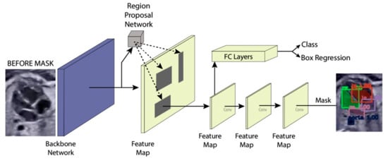 In this study, the instance segmentation approach is developed based on Mask-RCNN architecture (refer to Figure 6) [18,22]. The Mask-RCNN structure has two main processes, region proposal networks (RPNs) as feature extraction and fully convolutional networks (FCNs) as multi-task learning process in terms of simultaneous classification, detection, and segmentation.