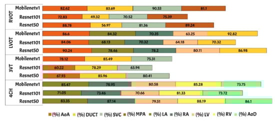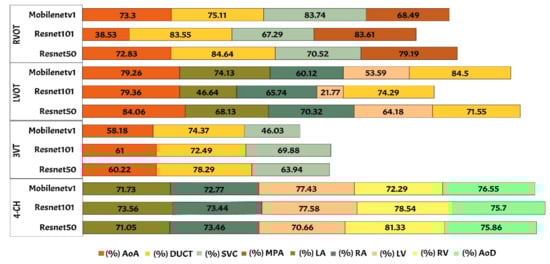 Generally, maternal–fetal clinicians use their judgement to determine whether certain heart substructures are in the correct anatomical localizations by comparing normal and abnormal fetal heart images. Four standard views in the ultrasound images are used in examinations to perform fetal heart diagnoses. In this study, the fetal heart view was segmented automatically using the proposed model. Fetal heart chamber as an object should be detected and segmented in the four fetal heart standard views namely, AoA, AoD, LA, RA, LV, RV, DUCT, SVC, and MPA. Figure 8 and Figure 9 presented the heart chamber prediction performance for a standard fetal heart scan in terms of the IoU and DCS (Jaccard index) performance. A total of 17 heart chambers are needed to be segmented and detected: five objects for 4CH view, three objects for 3VT view, five objects for LVOT view, and four objects for RVOT view.