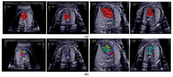 - Sobhaninia, Z.; Rafiei, S.; Emami, A.; Karimi, N.; Najarian, K.; Samavi, S.; Soroushmehr, S.M.R. Fetal Ultrasound Image Segmentation for Measuring Biometric Parameters Using Multi-Task Deep Learning. In Proceedings of the 2019 41st Annual International Conference of the IEEE Engineering in Medicine and Biology Society (EMBC), Berlin, Germany, 23–27 July 2019; Volume 2019, pp. 6545–6548. [Google Scholar]