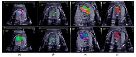 The IoU and DCS performance shows that the instance segmentation with the ResNet50 architecture as the backbone produced excellent predictions for all chambers in each view. Therefore, the Mask-RCNN with the ResNet50 architecture as the backbone of RPNs could segmented and detected the object based on the annotated RoI. In Figure 10a, the sample of segmentation result of fetal standard heart view is provided, and Figure 10b shows the heart chamber segmentation is presented separately. The standard view segmentation, to mark the shape of the cross sectional of the fetal heart, and the heart chambers segmentation, to show the part of each cross-sectional, belong here, whereas in Figure 11a–d, we experimented on two combinations, in such process a fetal heart view and heart chamber is merged, with about 17 heart chamber objects and four heart standard views to predict. Figure 11a,d shows the sample of segmentation results with different colors, but each object has the same description as Figure 10a,b. Based on the proposed model, all objects can be predicted with satisfactory performance (about 96.59% mAP, 79.97% IoU, and 89.70% DCS). The high mAP shows that the object detection process based on the proposed model obtained the overlapping area between the annotated and predicted RoIs of each bounding box close to 100%. The proposed Mask-RCNN model with ResNet50 yielded a 3.41% error in prediction between the annotated and predicted RoIs.