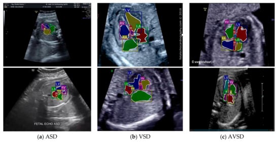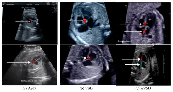 Computer-aided diagnosis (CAD) with artificial intelligence (AI) can be used in fetal echocardiography image assessment to automatically segment and classify the fetal heart organ [11,12,13] and detect defects in the heart septum [7]. In the anatomically structure, CHDs condition commonly is recognized by a hole in atria, ventricle, or both, named atrial septal defect (ASD), ventricular septal defect (VSD), and atrioventricular septal defect (AVSD) [3,5], respectively. These conditions are very dangerous, as they allow shunt of blood flow from the right heart chambers to the left, and vice versa [3]. The deep learning (DL)-based convolutional neural networks (CNNs) architecture is an AI approach that can apply to fetal object diagnosis [6,7,9,10,11,12,13,14,15,16,17,18].