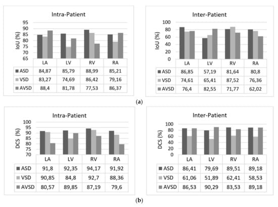 The performance in fetal heart chamber segmentation in 4CH view based on intra- and inter-patient scenario: (a) IoU and (b) DCS.
