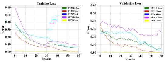 The proposed instance segmentation model in RPNs and FCNs block can simultaneously perform three processes: classification, detection, and segmentation. Therefore, three losses can be achieved, namely, object detection loss or bbox loss, classification or class loss, and segmentation or mask loss. During the training phase, we added an early stopping mechanism in order to prevent the model becoming overfit to the training data. We monitor the change of validation loss in order to stop the training. As result, the loss curve can be seen in Figure 15, all the response in RPNs and FCNs in the training and validation processes decreased to the stability (zero) point; the gap between the two curves of training/validation was relatively small. The RPNs’ response reaches around 0.1 to 0.25 detection loss in training and validation, and around 0.003 classification loss in training and validation. In the FCNs’ response, produce detection loss in training and validation was around 0.05 to 0.12, classification loss in training and validation was around 0.02, segmentation loss in training and validation was around 0.07 to 0.1, and finally total loss in the proposed model in training and validation was around 0.3 to 0.8. Hence, we concluded that the proposed model did not experience overfitting during the training process, despite the limitations in the training data.