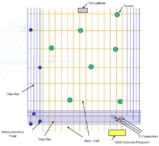 The previous research incorporated the electronic and sensing technologies during the actual manufacture of the textile. The technique presented in this section predates these latest developments significantly and hails from the late 1990s. It is described because it is a considerably different method and is conceptually similar to the architecture that we are proposing. The solution developed by [] is similarly pervasive [], but they achieve this by another route. They have developed a so-called Wearable Motherboard™ (WM) or Smart Shirt [,], a “platform” for sensors and monitoring devices that can unobtrusively monitor the health and wellbeing of individuals (directly and/or remotely). This can be considered the first responsive textile structure designed for a medical application, specifically for injury to soldiers, detecting bullet wounds, and special sensors and interconnects to monitor the body’s vital signs during combat conditions [,].