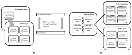 Overview of textile design: (a) Loose coupled layers—layers are aligned correctly through press studs and Velcro fastenings; (b) Implementing layers from design—a single design is sufficient to produce the layer with Input/Outputs. Input = capacitive sensors; Output = LEDs, vibrator motor, music player.