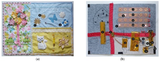 Sensory and memory stimulation therapies have the potential to help improve many dementia-specific issues for individuals living in long-term care settings [,]. Techniques are very varied and include multisensory stimulation room sessions, aromatherapy and massage, dance/movement therapy [], music therapy [,,], and, related to this research, “comforting fabric artefacts”. These artefacts include aprons worn around the neck, fixed around the back, and quilts and smaller textiles designed to lie on a person’s lap while sitting. To stimulate the senses, they incorporate various features to play with, or “fiddle with” (hence the name “fiddle blankets”) such as zippers or fabric pieces. Recent additions include embedded microelectronics (sound, lights, and other feedback), which further add to the sensory experience [,,]. Personalization can further add to the enjoyment of the textile, for instance, by creating textile representations of things, people, or memories that have meaning to the owner.