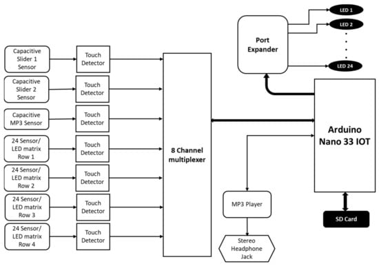 The schematic block diagram of different components and their interconnections within the underlying technological layer (from Figure 3b), is presented in Figure 4. The capacitive sliding sensors and the capacitive touch sensors from each row of the LED array are connected to the 8-channel multiplexer (TCA9548A) through the touch detector (AT42QT1070 for the touch sensors and CAP1296 for the capacitive sliding sensors). The multiplexer communicates with the Arduino Nano 33 IOT. The Arduino [] is also connected to (i) a 24 LED array through the port extender (NXP PCA9535), (ii) the MP3 player is connected to a stereo headphone jack, and (iii) an SD card for local data logging and storage. The detailed circuit layout of the capacitive touch sensors and the LED array connections are presented in Appendix A as Figure A1. All input/output devices (LEDs, capacitive touch, and sliding sensors, MP3 player, and the stereo jack) are mapped to a specific location on the artifact (Figure 3a). The selection of required switches/LEDs can be altered through appropriately programming the Arduino. This will allow an artisan the license to alter and shape the top layer to suit each patient’s needs.