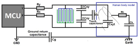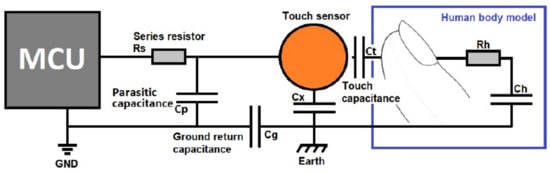 The capacitance of the sensor is comprised of parasitic capacitance (CP) in parallel with ground return capacitances (CX and CG in series). When a finger approaches, the human body model is applied, which increases the capacitance of the sensor through the series capacitance CT and CH in parallel with CX. The value of CT (1 pF) is much smaller than both CH and CG (100 pF each). It is accepted that the HBM capacitance is between 100 and 200 pF []. The total capacitance can be calculated using (2).