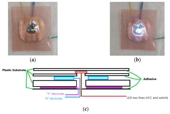The picture of the constructed CTS1 is shown in Figure 7a with the LED switched off, and Figure 7b with the LED switched on. The 50% copper mesh guard electrodes can also be seen in both Figure 7a,b. The construction principle of CTS1 is presented in Figure 7c. These CTS1s can be identified in the underlying technology layer (Figure 3b) as items 7,8,9,10.