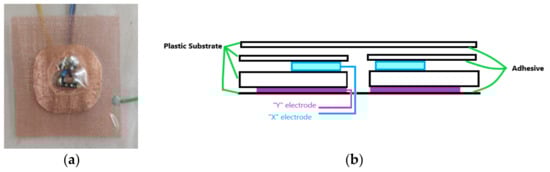 (a) Capacitive touch sensor (Capacitive Touch Sensor 2—CTS2) (item 4 in Figure 3b), and (b) construction principle.