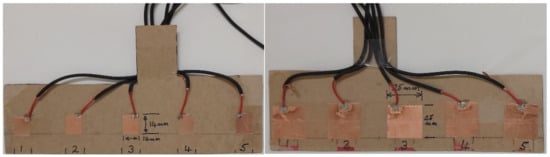 Three different types of self-capacitance touch sensors were constructed and used in the technological layer (Figure 3b). They are: (i) Capacitive Touch Sensor 1 (CTS1)—for switching the LEDs, as part of gamification (items 7,8,9,10 in Figure 3b), (ii) Capacitive Touch Sensor 2 (CTS2)—for controlling the MP3 music player based on user input (item 4 in Figure 3b), and (iii) Capacitive Touch Slider Sensor 1 (CTSS1)—for interactive playing with the cat and tree (item 1,2 in Figure 3b).