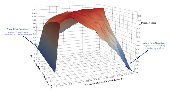 Illustrative example: Decision F1 score as a function of normalized aleatoric and epistemic confidence thresholds.
