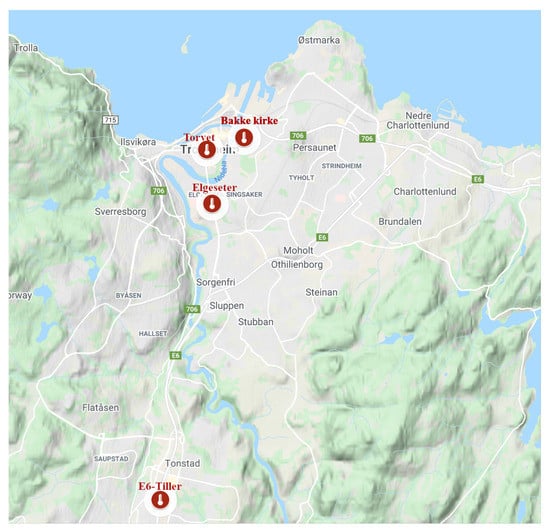 We are trying to build a model for forecasting air quality trends at pre-defined locations and for a specified forecast horizon. In our case study, we want to forecast the level of microscopic particles in the air, known as particulate matter (PM). These are inhalable particles with two types: coarse particles with a diameter less than 10 () and fine particles with a diameter less than (). The forecast predicts pollutant levels for the next 24 h at four monitoring stations in the city of Trondheim, as shown in Figure 2. The stakeholders, policymakers of the municipality, would like to estimate if the concentration of air particles exceeds certain thresholds following the Common Air Quality Index (CAQI) used in Europe [36], as shown in Table 1. This can be achieved through value regression or by directly classifying threshold exceedance levels. We will explore probabilistic models that forecast air quality values and predict threshold exceedance events. Using probabilistic models provides more qualitative information since decision-making largely depends on the credibility intervals of specific predictions. The forecast is based on explanatory variables, such as historical air quality measurements, meteorological data, traffic, and street-cleaning reports from the municipality.