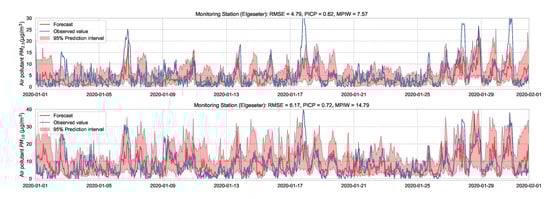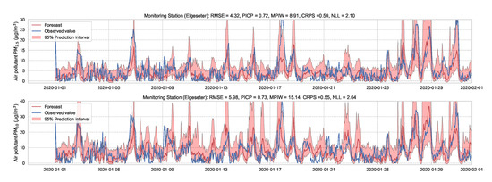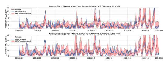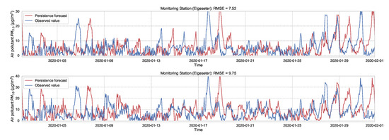 As a baseline for comparison and to motivate the use of evaluation metrics, we test the performance of non-probabilistic models, such as persistence, XGBoost, and gradient boosting models. A simple baseline predictor is a persistence forecast, which uses the diurnal patterns of the observations. To predict a value in the future, we use the value observed 24 h earlier. Figure 4 shows the results of the persistence model when forecasting the PM-value over one month (January 2020). Suppose is the forecast value, while is the true observed value at time t, then we can evaluate the aggregated accuracy over a time period T using the root-mean-square error: