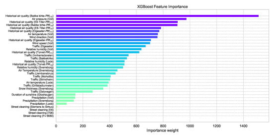 One advantage of using an XGBoost model is the feasibility of retrieving the feature importance by assigning a score to each input feature, which indicates how useful that feature is when making a prediction, thus contributing to prediction interpretation. Figure 6 shows the feature importance of the XGBoost forecast shown in Figure 5 (a more detailed description of the features can be found in Appendix A.