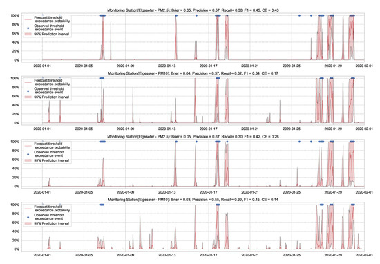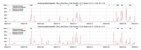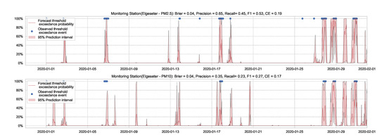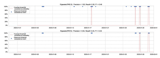 Figure 7 shows the results of the XGBoost model when predicting threshold exceedance probability. The blue dots indicate the points in time (hours) when air pollutants actually exceeded the threshold level. The red line represents the predicted probability in percentages. We see that with higher probability, the model predicts a more likely event of threshold exceedance at that specific time.