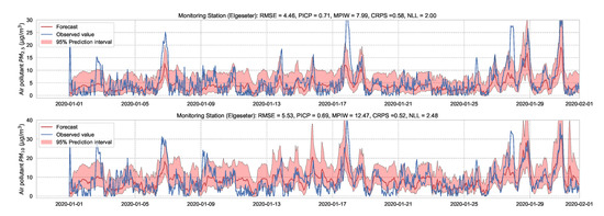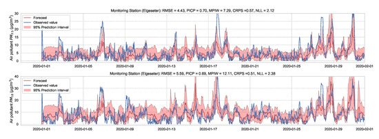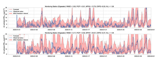 Although physics-based models [18,19,22] can provide long-range air pollution information, they require significant domain knowledge and complex modeling of dispersion, chemical transport, and meteorological processes. Additionally, physics-based models involve structural uncertainty, low spatial resolution, and do not capture abrupt and short-term changes in air pollution. Data-driven modeling based on historical data [23,24,25] can complement physics-based modeling by learning directly from air quality measurements and providing a more reliable short-term prediction. For example, Lepperod et al. [23] deployed stationary and mobile micro-sensor devices and used Narrowband IoT (NB-IoT) to aggregate air quality data from these sensors. Then, they applied machine learning methods to predict air quality in the next 48 h using observations of sensors’ measurements, traffic, and weather data. Zhou et al. [25] used long short-term memory (LSTM) to forecast multi-step time-series of air quality, while Mokhtari et al. [26] proposed combining a convolutional neural network (CNN) with LSTM for air quality prediction and quantified the uncertainty using quantile regression and MC dropout. Tao et al. [27] used 1D CNNs and a Bidirectional gated recurrent unit (GRU) for a short-term forecast of fine air particles. Pucer et al. [28] used Gaussian Processes (GP) to forecast daily air-pollutant levels, and Aznarte et al. [29] proposed using quantile regression for probabilistic forecasting of extreme nitrogen dioxide () pollution.