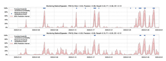 Predicting the threshold exceedance probability of the air pollutant level using an XGBoost model in one representative monitoring station.