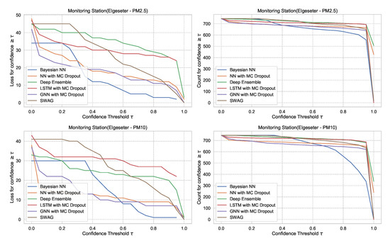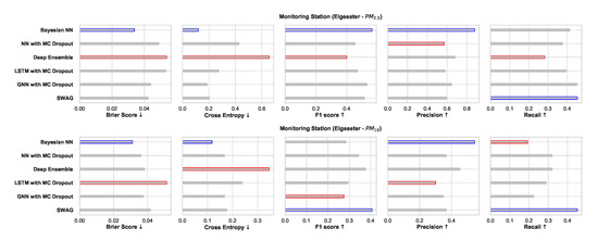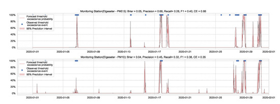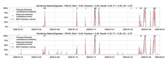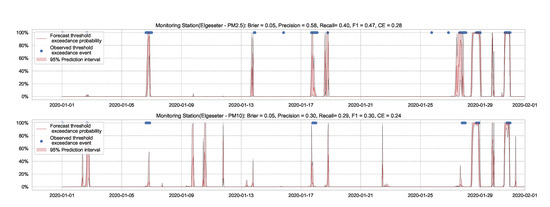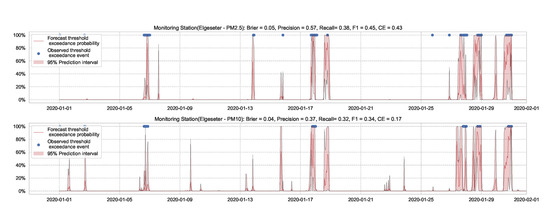 For the threshold exceedance prediction task, we can use XGBoost to train a binary classifier to predict the probability of threshold exceedance. By using a proper scoring rule [43], such as the cross-entropy as a training criterion, we obtain predictive probabilities. Notably, these probabilities do not represent the model (epistemic) uncertainty. Rather, they represent data (aleatoric) uncertainty. In addition to cross-entropy, we need to evaluate performance using another metric that the model was not optimizing. We can use the Brier score [44], which is a strictly proper scoring rule [43] and metric to evaluate the reliability of predictive probabilities. Suppose at a time, t, the true class label is represented by (1 when pollutant level exceeds the threshold, 0 if not), while the predicted probability is represented by . Then we calculate the cross-entropy (CE) and Brier Score (BS) as follows: