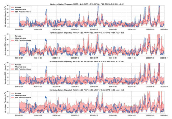 Deep probabilistic forecast of air quality using deep ensemble at four monitoring stations.