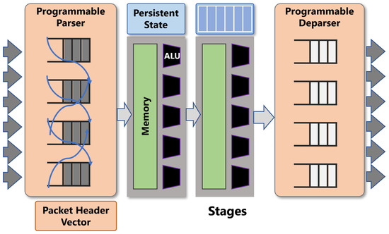 - Bosshart, P.; Gibb, G.; Kim, H.S.; Varghese, G.; McKeown, N.; Izzard, M.; Mujica, F.; Horowitz, M. Forwarding metamorphosis: Fast programmable match-action processing in hardware for SDN. ACM SIGCOMM Comput. Commun. Rev. 2013, 43, 99–110. [Google Scholar] [CrossRef]