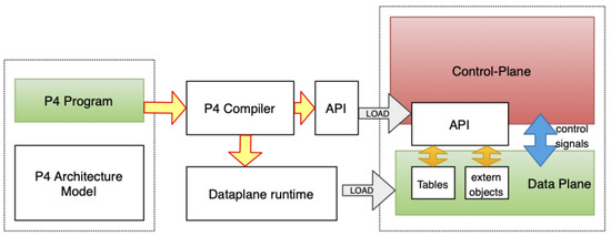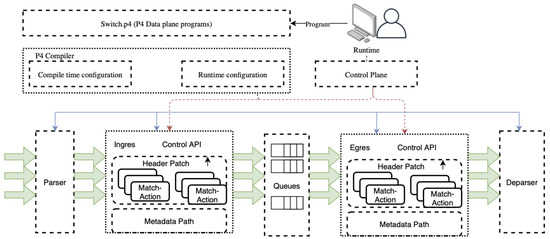 Although there are several studies developing and using programmable hardware [8,9,10,11], the early use of programmable hardware is to make telemetry data easy to use. Telemetry data are crucial for an automated future but generating telemetry data is not a trivial task. Adding more hardware and software to the routing and switching systems makes the current architecture more complex than ever. Since the telemetry data are generated at the packet level, the most logical way of doing this seems to be arising from the packet generating software at the hardware level, which leads us to P4, Programming protocol-independent Packet Processors, as it is referred to in the original paper defining it [12]. P4 is a domain-specific programming language for packet-processing hardware such as a router, switch, network interface cards, and network function related appliances that work and data plane based on the decisions from the control plane as in Figure 2.