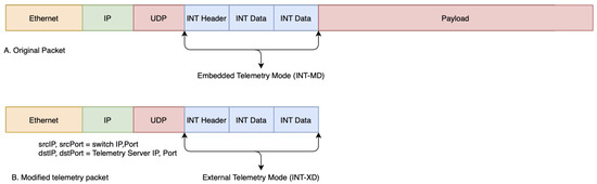 Although telemetry data can be collected in any way that is defined by P4 code, there are two types of telemetry that are defined in a standard P4 implementation [6]. As shown in Figure 4, telemetry data can be either embedded within a packet, which is called INT-MD, or extracted as a separate packet, called INT-XD. INT-MD is usually used by intermediate routers (switches to identify any type of problem that might occur along the path, which INT-XD is useful for external applications that do not need the payload of the original packet. In this experiment, INT metadata are used to help to the measurement of a switch internal state such as ingress/egress port ID, switch ID, queue occupancy, processing time, etc. These metrics are application agnostic and help in application-layer processing.