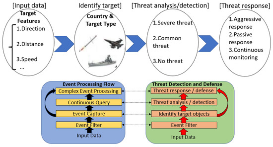 A ship combat system uses a rule-based event processing application for threat analysis and weapon response [1,2] for target objects collected in real time. As shown in Figure 1, it is assumed that the target object data collected from the radar sensor, sonar sensor, and electromagnetic sensor [3] installed on the ship are ID, speed, elevation, IFF, direction, location, and time; here, ID is the identifier of a target object, and IFF is the foe or friendly identification information. The input data in Figure 1 are stream data collected from the data distribution service topic [4]. Threat analysis and decision making are performed by applying rules for event processing, event capturing, continuous query (CQ) [5,6,7,8] processing, and complex event processing [9,10,11,12,13,14,15,16]. For complex event processing, the operator scheduling method [17] that uses a similarity-based preference was proposed to address the difficulty in determining complex events due to the uncertainty of dynamic input events; however, it is still not suitable to address the processing performance of rule binding. The continuous query repeatedly executes a given query condition for each stream of data that is continuously input in real time.