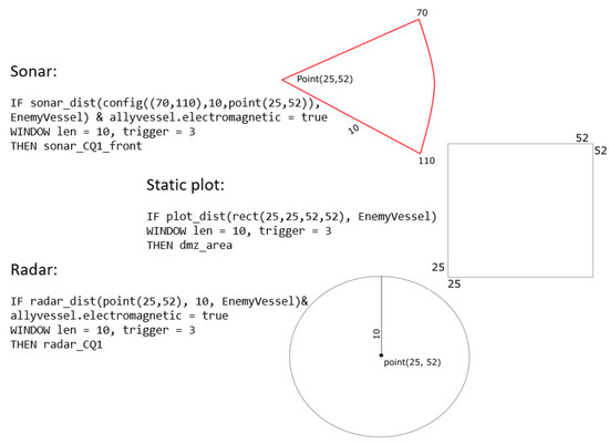 The spatiotemporal condition was expressed as a polygonal area with a fixed position, or a sector or circle set by the radar or sonar sensor range of the ship, as shown in Figure 4. When the vessel moved, the sectoral or circular space-time condition was expressed as a spatiotemporal condition because the position of the space condition changed with time. As shown in Figure 4, when a rule including a spatial condition for the beta node EnemyVessel was added, it was processed as an update of the continuous query index. When the spatial CQ rule is added, as shown in Figure 4, an alpha node bound is added to the beta node shown in Figure 3.
