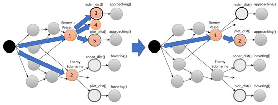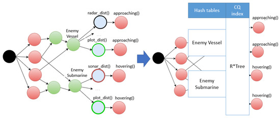 As can be observed in Figure 7, when there was no hash index for the ‘EnemyVessel’ beta node, alpha nodes 3, 4, and 5 were examined consecutively. When a hash index was created, it was directly stabbed to alpha node 2 with respect to beta node 1. Since a hash index was used, all events were classified using buckets in the hash table, indicating the entity type of each event. The node-stabbing process using the hash index was implemented based on Algorithm 2. Node stabbing was processed with intersect () for the event location, as shown in Algorithm 2.