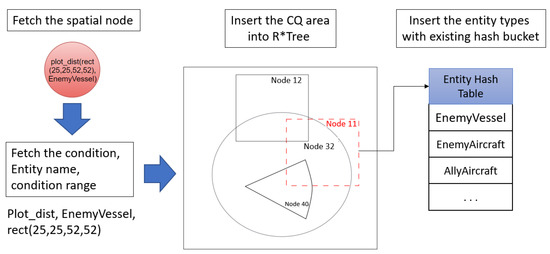 A spatial node referred to as ‘plot_dist(rect(25,25,52,52) EnemyVessel’ was created from the rules described in the text. Node 11 (red dotted square in Figure 6), representing the MBR of the spatial node, was inserted into the R* tree. By inserting the entity of the spatial node into the entity hash table by type, the index and hash table were connected. For example, as shown in Figure 6, there was ‘plot_dist( )’ in the spatial node of the rule; thus, the corresponding MBR was inserted into the R* tree. Since these rules only applied to events for ‘EnemyVessel’, stabbing the MBR node was added from the R* tree points to the hash bucket of the ‘Entity Hash Table’. The CQ index and hashing bucket process for processing spatial nodes in the Rete algorithm are described in Algorithm 1.