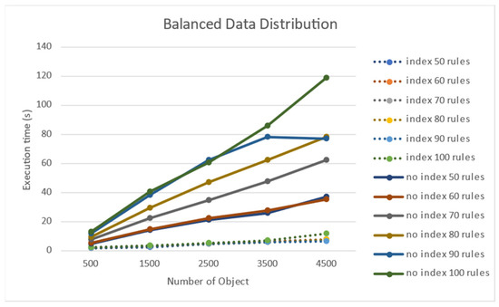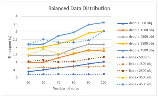When the target objects were evenly distributed in the performance comparison experiment with Drool, the performance effect of the number of rules was lower than the effect of the number of target objects. As can be observed in Figure 14, when the number of target objects is 4500 for 100 rules, Drool exceeds 3.5 s, and the node index method requires more than 3 s. Based on the experimental results, the increase in the number of rules had an insignificant effect on performance. This may be attributed to the non-application of the compiled structure and index of the rules. Nonetheless, it was concluded that an increase in the number of target objects had a greater impact on performance because it appeared as an increase in processing load, whether it was a Drool or a node index.