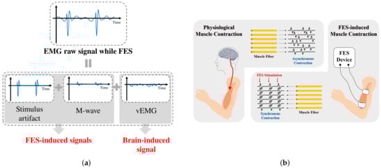 Conceptual design of EMG signals during FES: (a) Components of contaminated EMG signal during FES and (b) comparison of physiological muscle contraction and FES-induced muscle contraction.