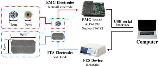 The experimental setup is shown in Figure 3. First, an EMG board comprising ADS-1299 (Texas Instruments []) and Nucleo-F767ZI (STMicroelectornics []) was designed. We used a commercially available EMG chip to sample a set of EMG data at  and transferred the data to a computer through a USB interface. Second, an FES device (RehaStim, Hasomed) was utilized to apply electrical stimulation. Finally, a Kendall hydrogel electrode (Covidien) and ValuTrode electrode (Axelgaard Manufacturing) were utilized for EMG and FES, respectively.