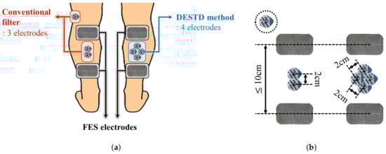 Figure 4 shows the electrode attachment positions for comparative data analysis. In all experiments, each EMG signal was simultaneously measured using the conventional filters and DESTD method under the same stimulation conditions. The conventional filters for comparison with the proposed DESTD method were comb filter and Gram–Schmidt filter in consideration of real-time applicability. As shown in the Figure 4b, the inter-electrode distances for EMG for each method were set as  to meet the common standard for measuring bipolar surface EMG signals as much as possible []. In addition, the inter-electrode distance for FES was adjusted according to the GCM muscle size of each subject, and it was determined as  or more to generate sufficient muscle contraction.