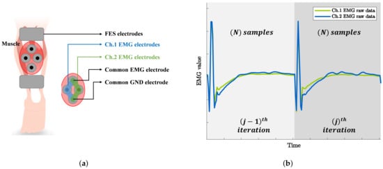 where  and  are the FES-induced EMG signal and voluntarily brain-induced vEMG signal, respectively, and i is the sampling index of EMG. Note that the continuous EMG signal can be divided into a constant number of samples because the electrical stimulation has a set of iterative patterns for a given stimulation frequency, as shown in Figure 5b. Therefore, j and N denote the stimulation iteration index of FES and the total number of samples between stimulation iterations, respectively. In addition, (1) is the raw EMG signal from EMG channel 1. Thus, the raw EMG signal from the other channel can be defined as