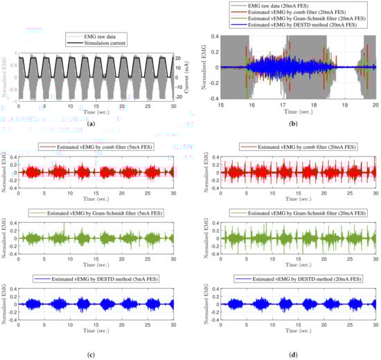 Figure 7 shows an example of the EMG experimental results obtained when the rapidly changing FES with a maximum intensity of  was applied to the GCM muscle. As shown in Figure 7a, the vEMG signal was completely covered by the FES artifact and M-wave. Figure 7c,d show the vEMG data estimated from the contaminated EMG data by the comb filter, Gram–Schmidt filter, and DESTD method, respectively, with FES. The DESTD method effectively removed the FES-induced signals regardless of the FES pattern compared to the comb filter and Gram–Schmidt filter. Figure 7b shows the FES-induced signal removal performances for each filter in more detail. When the stimulus intensity remained constant, all filters effectively removed the FES-induced signals. However, when the stimulus intensity changed, the conventional filters could not completely remove the FES-induced signals. In contrast, the DESTD method successfully removed the FES-induced signals while retaining the vEMG data.
