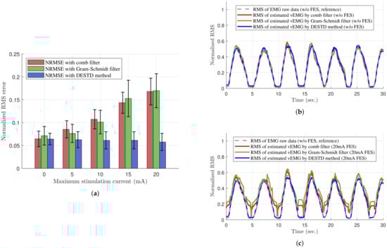Performance of removing the FES-induced signals of the comb filter, Gram–Schmidt filter, and DESTD method. (a) NRMSE values of the estimated vEMGs; (b) RMS values of the estimated vEMGs without FES; and (c) those with FES of  maximum stimulation current using the comb filter, Gram–Schmidt filter, and DESTD method.