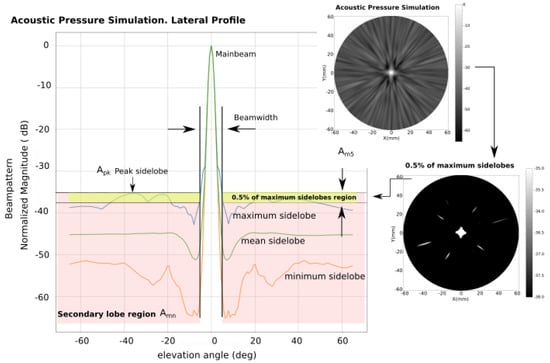 Elements used to evaluate the beampattern simulation. The beampattern is simulated in a semi-sphere (, , ). The three lateral profiles are composed of the semi-sphere by obtaining, at each elevation angle, the maximum, the mean and the minimum. The peak sidelobe and the mainlobe width are identified. The mean value of the sidelobes is . Furthermore, finally, the percentile of the maximum sidelobes is identified and evaluated by its mean value ().