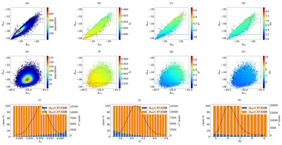 Results of 100,000 random cases of configuration 100I. In the first row, the apertures are presented in a vs. map, (a) population, (b) , (c) and (d) . In the second row, the apertures are presented in vs. map, (e) population, (f) , (g) and (h) . In the third row, the distribution of cases against the coarray parameters are presented, marking the proportion of cases that fulfill the threshold, (i) , (j) and (k) .