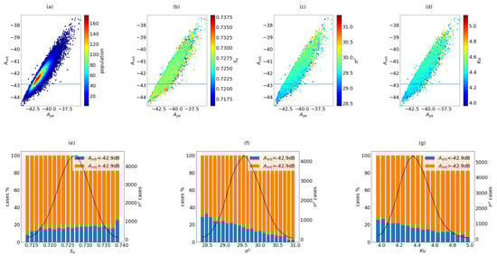 Results of 50,000 random cases of configuration 196I. In the first row, the apertures are presented in vs. map, (a) population, (b) , (c) and (d) . In the second row, the distribution of cases against the coarray parameters are presented, marking the proportion of case that fulfill the threshold, (e) , (f) and (g) .